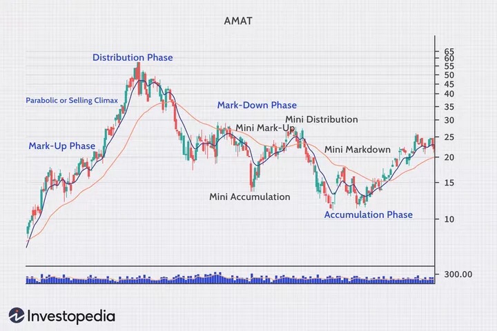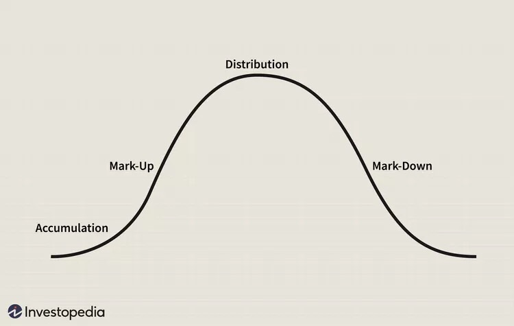 There are four phases of market cycles: the accumulation phase, mark-up phase, distribution phase, and downturn phase