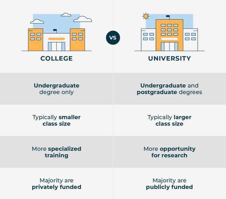 Colleges tend to be smaller and focus on a specialized field of study. Class sizes and student populations are typically smaller than at a university.